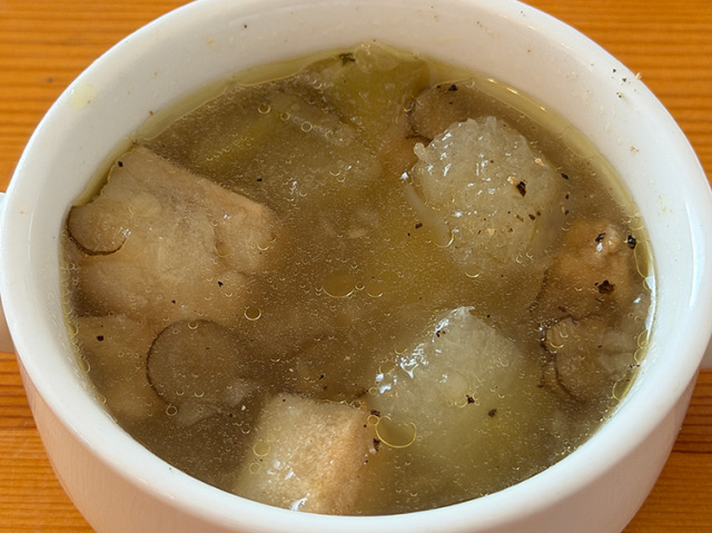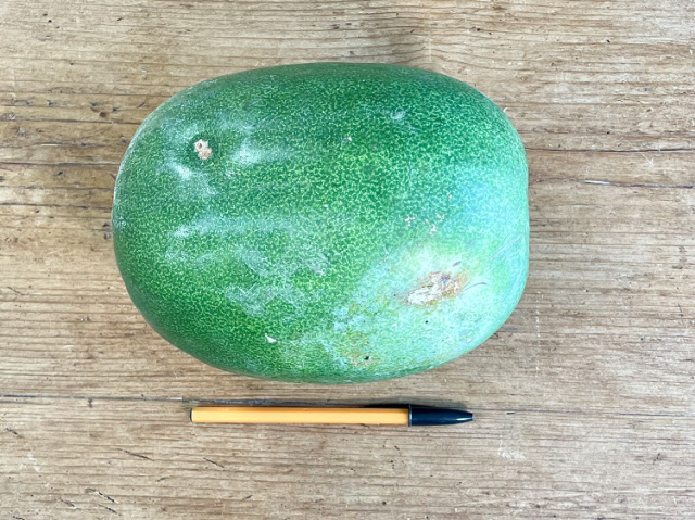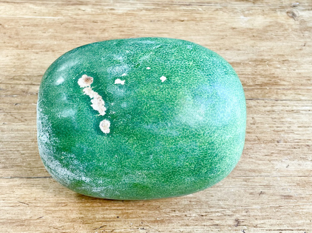 切り分けるのに扱いやすい大きさの冬瓜です。とても良く身がしまっていて新鮮です。今の時期は体を温めるスープに大活躍です。